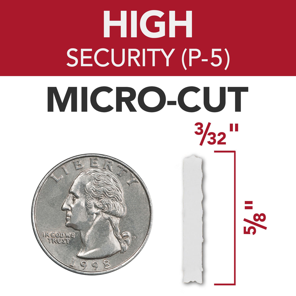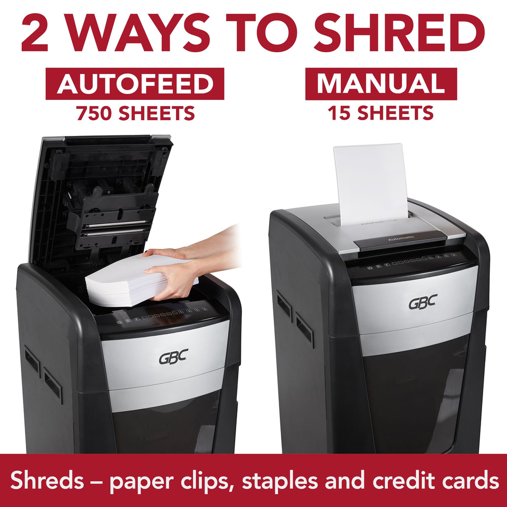Introducing the GBC 750M Autofeed+ Commercial Shredder, a high-performance machine designed for busy offices with bulk shredding needs. This industrial-grade shredder features micro cut technology, ensuring a P-5 security level to destroy paper, clips, staples, and credit cards into tiny 3/32 x 5/8 inch shreds. With an autofeed paper tray that can handle up to 750 sheets, you can enjoy a walk-away experience as it shreds automatically. Plus, manually feed up to 15 sheets at once for added convenience. The 37-gallon bin container stores high volumes of waste materials and alerts you when it reaches maximum capacity.