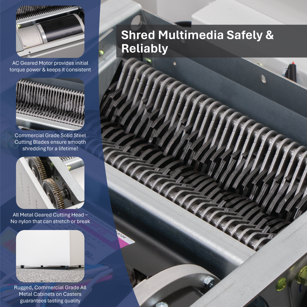 The Formax FD 8704CC Multimedia Shredder offers powerful protection for offices managing both paper and digital data. It shreds up to 45 sheets per pass and includes a separate feed slot for DVDs, CDs, and DV tapes. With a shredding speed of 12 feet per minute and secure cross-cut operation, it renders sensitive information completely unreadable.