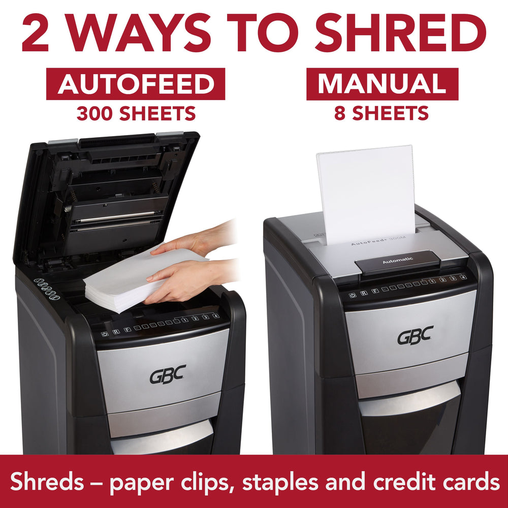 - Shreds up to 300 sheets automatically or 8 sheets manually