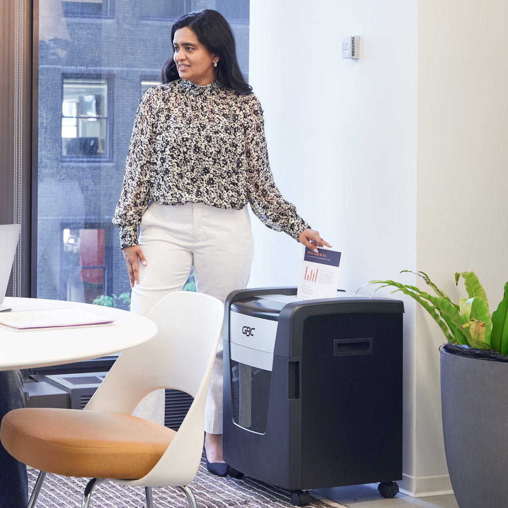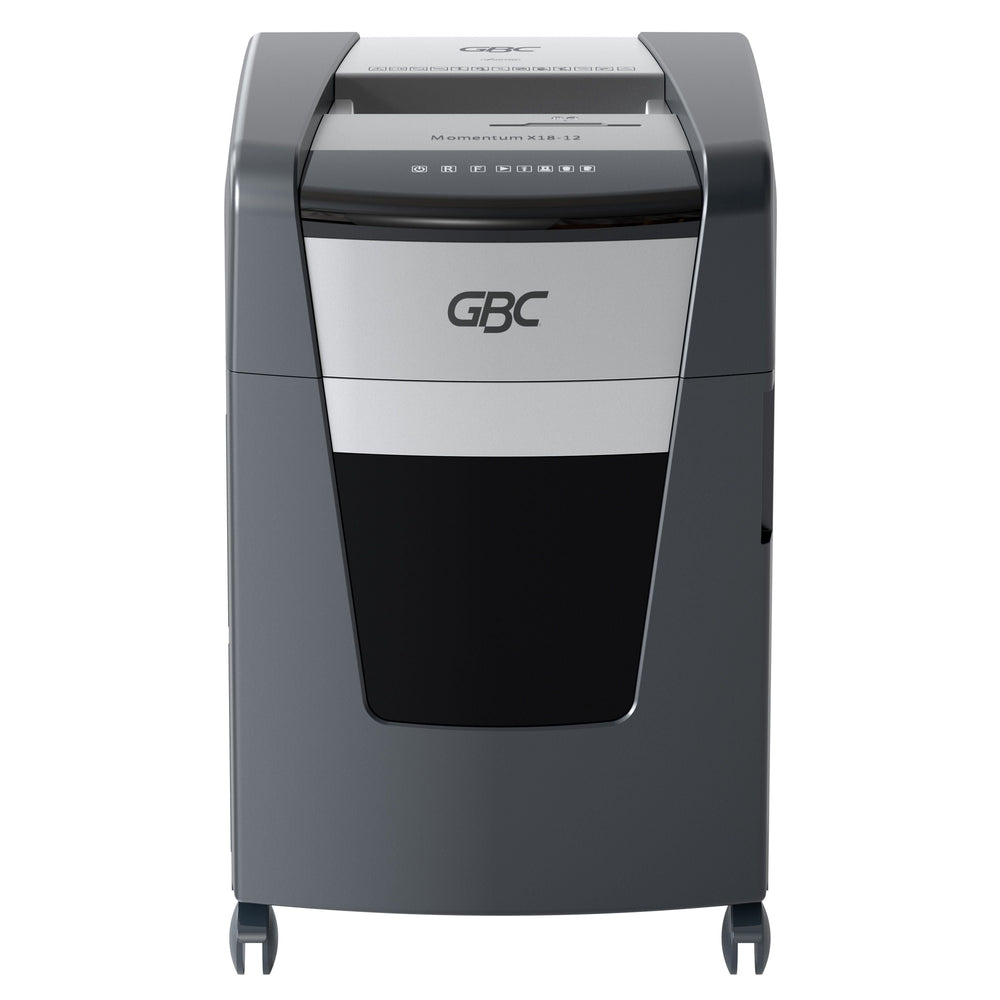 The GBC X18-12 Momentum Shredder offers a level P-4 security, making it ideal for shredding confidential paper documents. It features active-sensing, anti-jam technology that prevents paper jams and misfeeds before they happen. The commercial-grade motor and continuous runtime allow you to shred more documents without stopping. The bin-full indicator lets you know when it's time to empty the 12-gallon waste bin, while the quiet construction helps you stay focused while you work. With its automatic shutoff feature, the GBC X18-12 conserves energy when not in use. Choose the GBC X18-12 Momentum Shredder for efficient and secure shredding in your office.