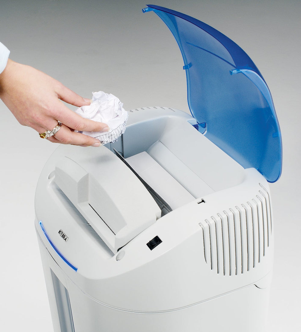 Featuring a "Throw and Shred" System and an Automatic Feeder with a Rotating Flap, this shredder can easily handle crumpled paper, ensuring smooth and hassle-free shredding. It is equipped with separate cutting knives for paper and plastic, storing the waste materials in two separate bins for easy disposal.
